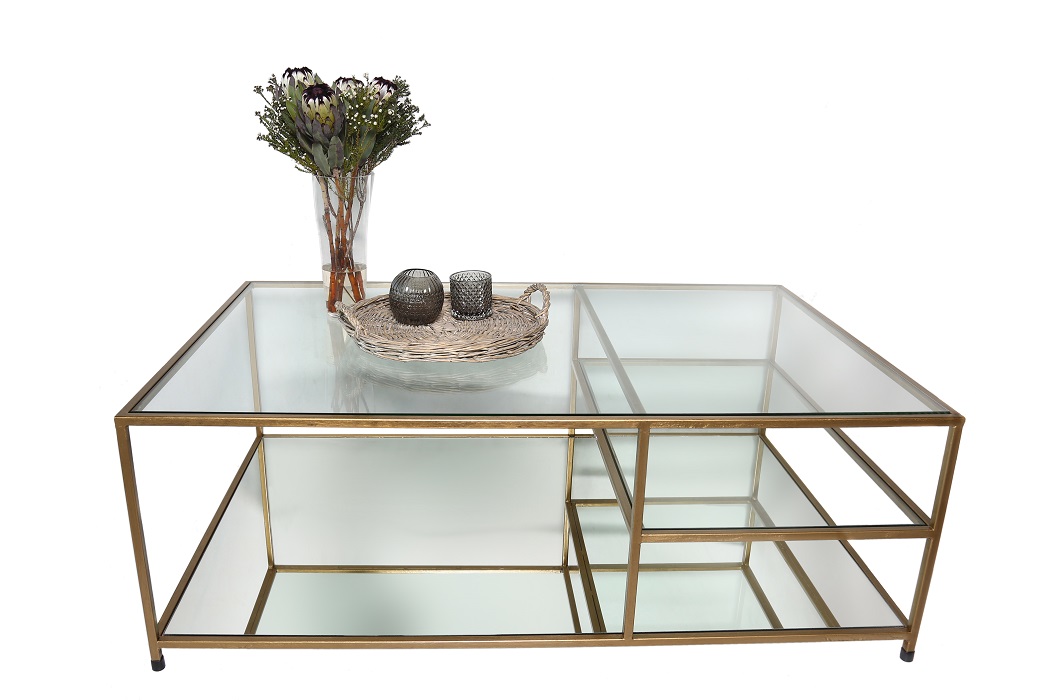 Glass top coffee table with mirror base supported by welded steel frame for indoor use.